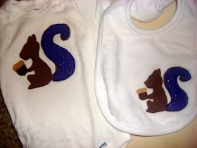 I ironed light and dark brown felt onto steam a seam and cut out acorns. Then I ironed them onto the onesie and bib.