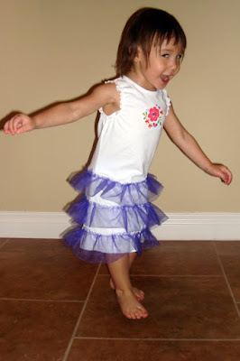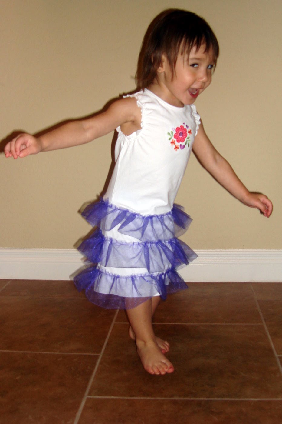I then folded each strip in half and used a basting stitch to close the open ends. I pulled the strings to gather the tulle into a ruffle. I scrunched the ruffle until each tulle piece was the width of the skirt. Then I stitched the ruffled tulle onto the skirt in three sections. I was very pleased with the outcome!