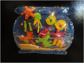 I had only planned on making magnets but then I got creative and added a big magnetic fish bowl carrying case. I first cut the fish bowl shape out of felt. Then I cut a matching vinyl piece for the front. I cut small squares to cover magnets on the four corners of the back piece. I cut another small vinyl piece to stitch inside for a pouch of sand and shells. I stitched it all together starting with the two vinyl pieces. To insert the sand, I stitched the top and sides of the vinyl together, poured in sand and shells, and stitched it while tilting it upward to avoid any spillage. This part was not easy and I recall making a huge mess! To further reinforce the sand area, I used super glue on a q-tip to seal the edges. The top of the fish bowl is not closed so your fish magnets can live in there or you can use it as a carrying case for road trips! Unfortunately an entire year later, our fish bowl is lost somewhere (my daughter's play room, bedroom, back yard, a friend's house, the car, etc., etc.) so I can't take any pictures to show you more specific instructions. This is the only picture I saved of the completed fish bowl from this project. How did that happen???