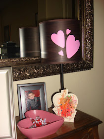 I used my cricut to cut out vinyl hearts to add some fun to the lamp. I'm looking forward to changing this up for different holidays. I also have a framed picture of my nephew, kisses in a heart dish, and another project displaying my daughter's crafting skills.