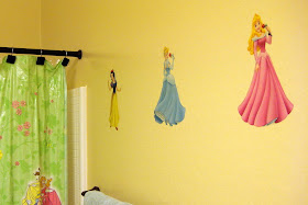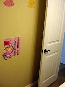 Instead of reducing the amount of pink sparkly characters in the bathroom, I decided to add more! We had a tulle clip holder that was pretty much falling apart (sorry I didn't take a picture before taking it apart). Yesterday I quickly made a hair accessory holder to organize all of my daughter's clips and headbands. I used modge podge to glue scrapbook paper to a 12" x 12" board. I didn't have any princess paper so I cut Pinkerella out of a book cover. She's not a Disney princess, but my daughter loves her! I used brads to separate sections in the ribbon to hold headbands and I added a felt envelope to hold hair ties.