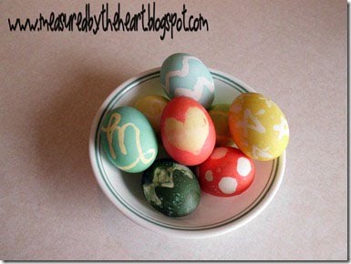 Check out this adorable and creative idea for dying Easter Eggs. I can't believe I didn't think of it myself. It is so simple and makes dying Easter Eggs so much more rewarding than the plain colored boring eggs, or brownish colored eggs which is what I usually end up with when I make the eggs with my son (because he likes to dye the eggs every color.)