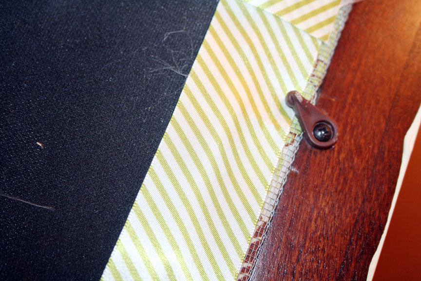 The next step was the insert. I used spray glue to glue a fabric that coordinated with my bathroom decor (green and teal). Then I covered the fabric (again using spray glue) with wire mesh. The key is only gluing the mesh to the outside edges so that you can slide the earring hooks on the mesh. Then I covered the back with the same ribbon to make it look finished, again using spray glue.