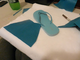 I started by cutting my felt pieces to cover the tops of the flip flops.  This was tricky and I'm sure if you're good with measuring and math (my college degree is justice studies, not math!), you could find a much easier way to figure out the dimensions.  I simply held up the felt to the shoe and started cutting until it seemed like a good fit.  I used my cut piece as a pattern and cut three more pieces to match.