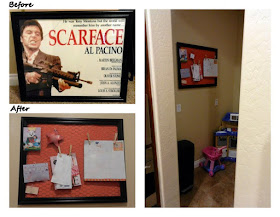 Just an FYI on the original print in the frame - my middle brother bought the framed print for my husband almost 10 years ago. It was hanging on the wall in my husband's first house for a couple of years. When we had the house for sale a realtor called and scheduled an appointment to see the house with their clients. We were surprised because a man and a little boy rang our doorbell at the appointment time but they did not have a realtor with them. We had a difficult time communicating because the man did not speak English. The little boy acted as an interpreter. The only words the man ever spoke directly to us was, "oh Scarface," as he looked at the picture hanging on the wall. They left and our door bell rang a second time. It was the realtor and her clients with the scheduled appointment. They were running late. The man and little boy stopped by because they just happened to see our for sale sign in the yard. The next day that man offered more than the our asking price and bought our house! We have always credited the Scarface picture for selling our house. I was really bummed about the glass breaking but am happy I was able to turn our good luck frame into something else we can use! The backing on the memo board is simply the back of the Scarface print (I painted it with the same orange paint used on the island).