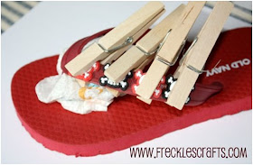 It takes some time for the glue to dry so here is a little tip: use clothespins to hold the embellishments in place while you move on to the next step! Works like a charm! I also put a paper towel around the toe strap to hold the straps up while the glue dried. This seemed to help keep the embellishments edges tight on the straps.