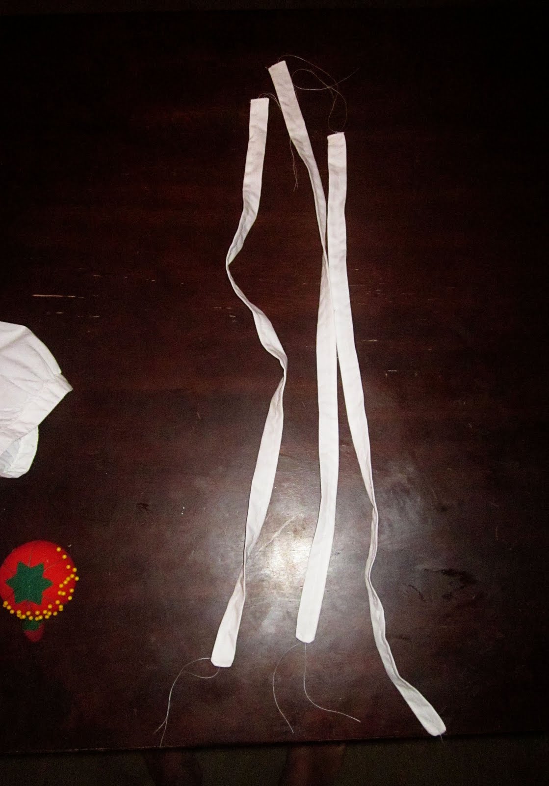 1. Cut 2 inch strips of any fabric you want to make the ruffles from. I cut 6 strips.2. With right sides facing fold the strip in half (hot dog) and sew down one end and the side. Then turn the strip right side out using a pencil or end of a wooden spoon.
