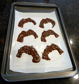 We used melted chocolate chips instead of chocolate melting wafers to make the hair.  I chose not to outline the hair with the darker chocolate simply because my "helpers" wanted to move on to the next step.