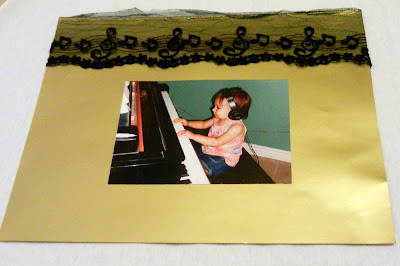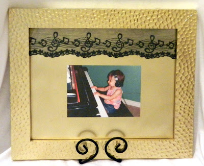 I used mtallic gold spray paint to completely change the look of the frame. I also painted cardstock for the back of the frame instead of purchasing a new photo mat.I had the perfect picture to go with the music notes on the lace. My daughter loves to play the piano at her grandma's house. Considering this is a gift for my mother in law, I decided to use a picture of my daughter playing her piano last year. I used double sided tape to hold the photo in place. A thin strip of hot glue held the lace on the handmade mat perfectly.