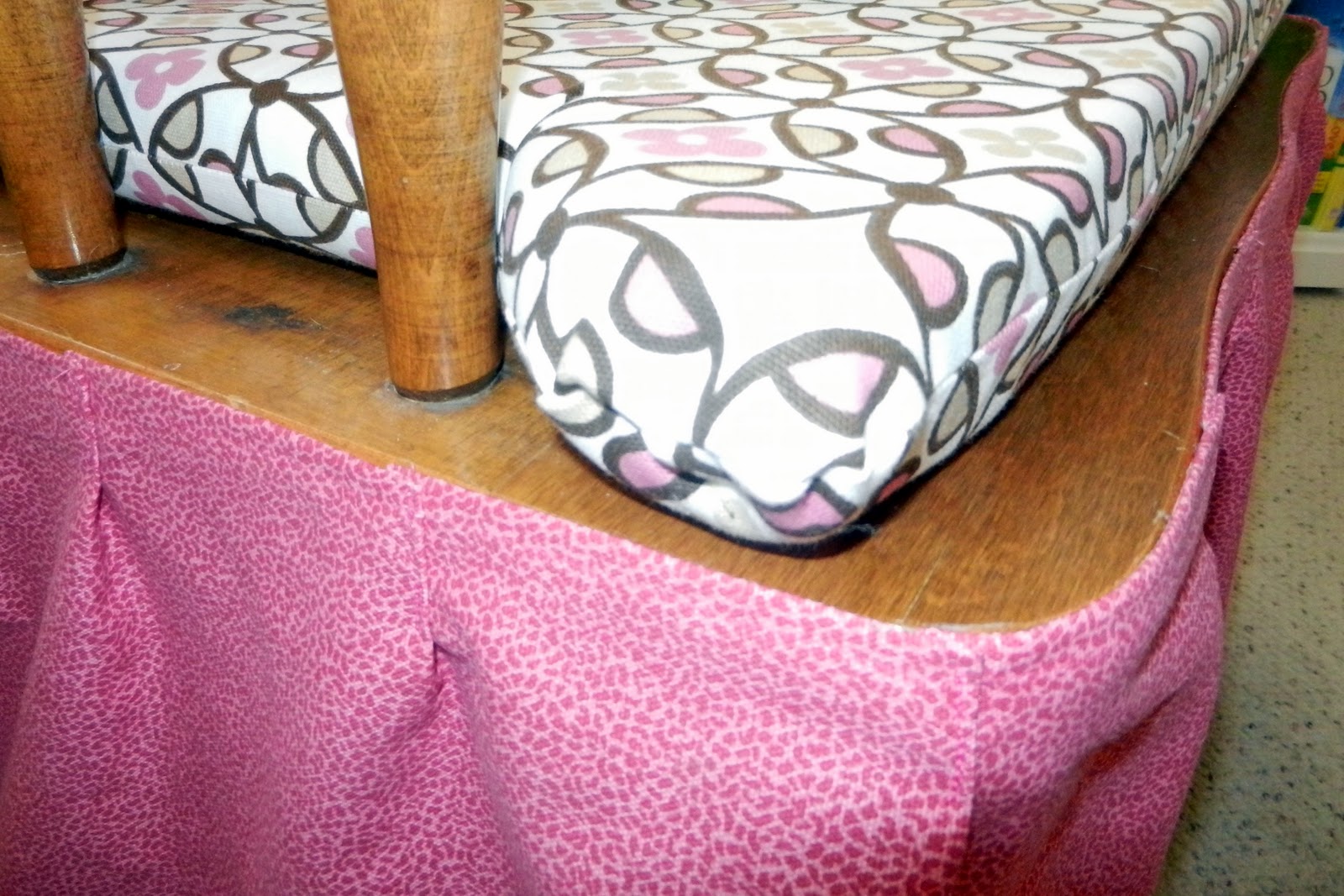 My friend's mother-in-law sewed cushion covers and a ruffle to match their first nursery. The ruffle was attached to the chair with velcro. I don't have a picture of the chair with the yellow cover but this is the removable ruffle: