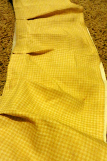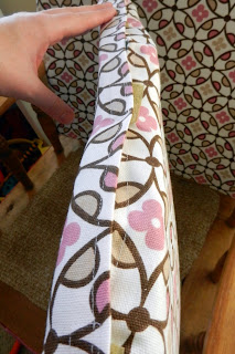 My friend asked if I could make her new cushions with pretty fabric. She had no interest in keeping the original cushions so we met at the craft store to buy foam and pick out fabric to start from scratch. Instead of taking the chair to my home for the project, I used the yellow covers as guidelines for the new cushions and covers. I didn't have the dimensions of the chair and it had been months since I'd seen it in person. I was nervous about using only the previous covers as guides. I hoped for the best when I brought the new cushions to my friend's home and was super excited when they fit the chair perfectly. I did not make the ruffle removable like in the previous makeover. I tacked the ruffle directly to the chair.