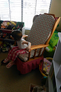 The chair didn't always look so cute. A good friend asked for a little help with the rocker she had in her daughters' bedroom. Her daughters are now two and four years old. She has been rocking both of them in that rocker at night since her oldest was newborn. She told me instead of buying a new chair when she found out she was pregnant with her oldest, she opted to use the rocker her husband had in college. He had no clue about the history of the chair. Prior to its first makeover, it looked like this: