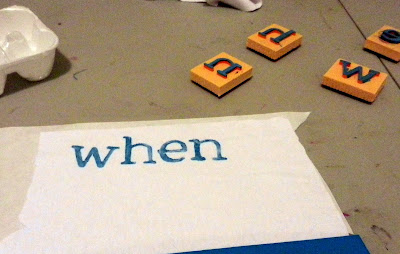 I started with foam stamps, fabric paint, and white cotton fabric to create the wording.
