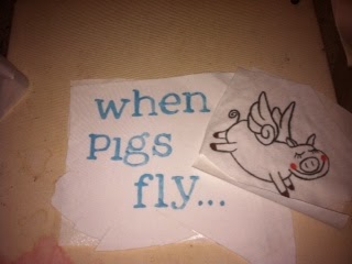 I carefully stamped the letters onto the fabric.While the letters were drying I started working on my flying pig. I had a hard time creating an image myself. I borrowed something from an Etsy page that I can't find again. I made the shirt really late and I thought I had saved the link. I feel horrible for not linking back to the artist. If you know the source to this cute piggie, please email me!