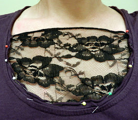 I was looking for a quick and easy upgrade. It didn't take long for me to decide to add a lace panel to the neckline. I cut some lace and pinned it to the shirt. I'm surprised I didn't injure myself while doing this! I don't have a dress form and didn't want to deal with using a seam ripper later. Probably not the best idea but it worked for me.