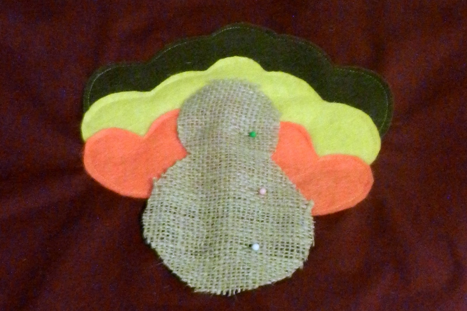 I used a plate from my daughter's tea set and a coffee can lid to trace the turkey's body on burlap.The other pieces were cut from felt with out a pattern.