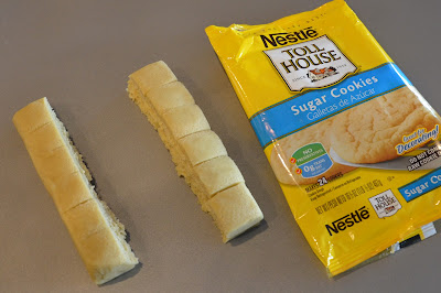 The peanut butter cookies sounded yummy but I wanted to do something quick because my little three year old helper was in the kitchen with me. I used cubed sugar cookie dough.
