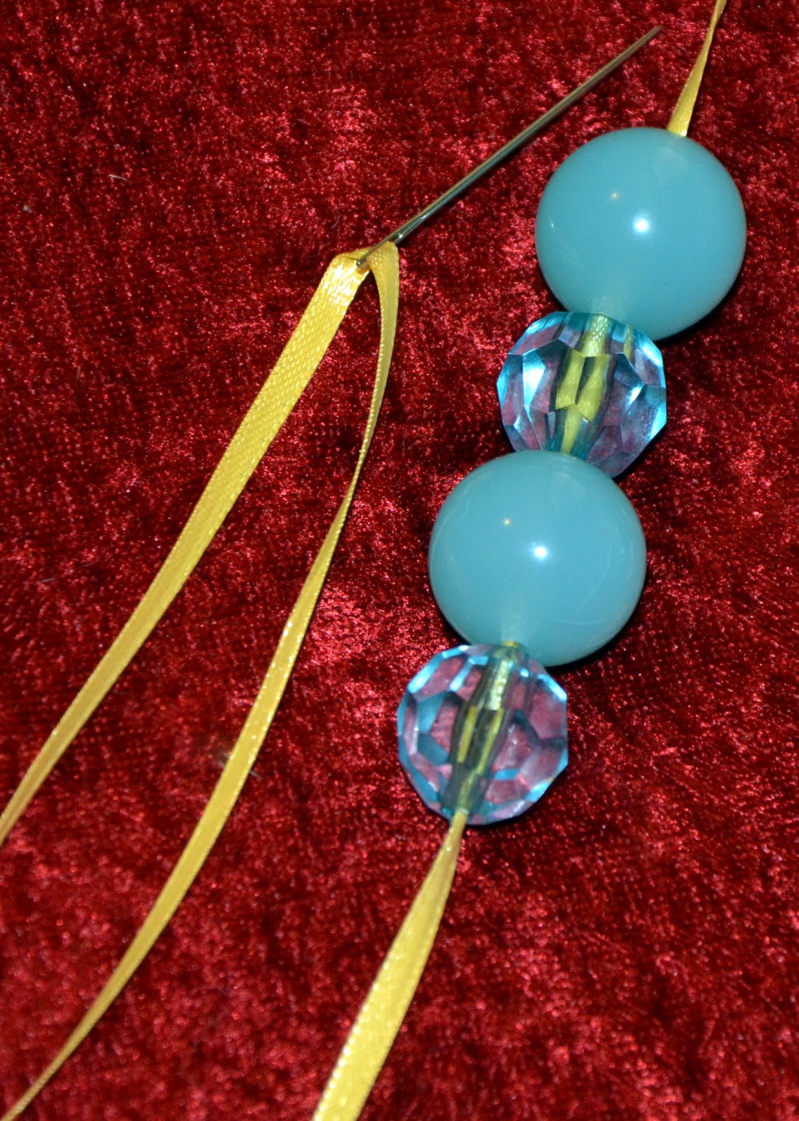 I'm a big fan of mustard yellow and turquoise together so this little yellow ribbon was perfect for my necklace. I used a needle to string the beads on the ribbon.