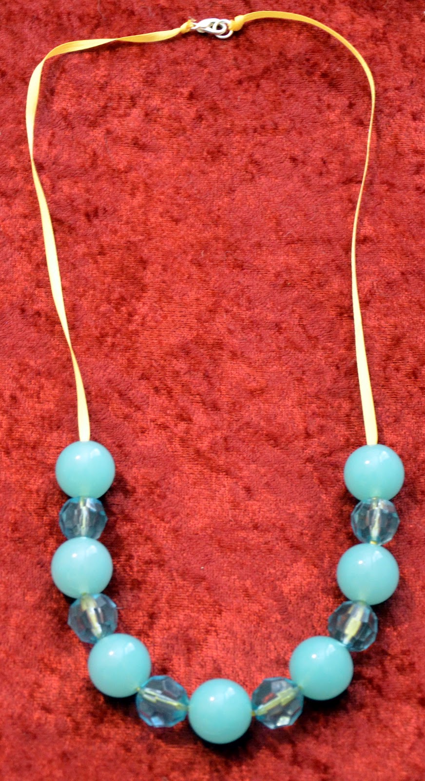 I'm a big fan of mustard yellow and turquoise together so this little yellow ribbon was perfect for my necklace. I used a needle to string the beads on the ribbon.
