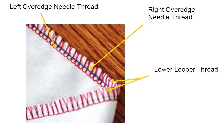 - three needles create parallel rows of topstitching and one looper sews an edge finish on underside