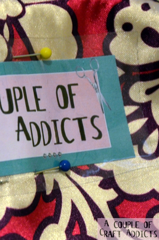 I used a small make-up bag I had received as a free sales promotion from Target last year. I printed our logo onto cardstock and then pinned a piece of vinyl over the paper. I used my sewing machine to zig zag stitch right over the vinyl.