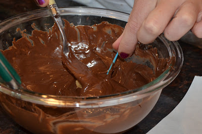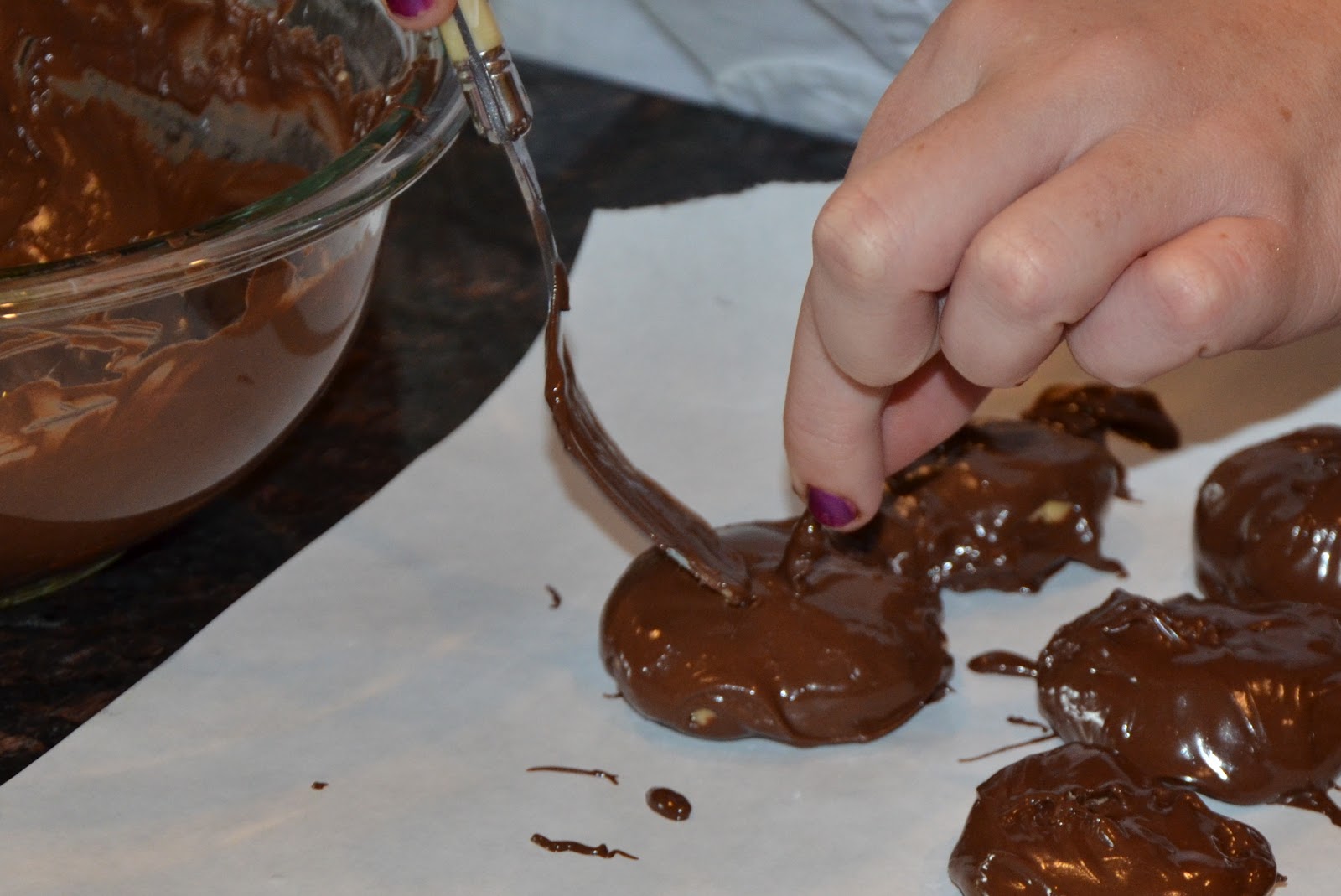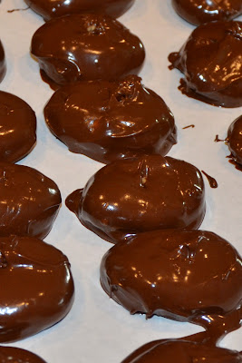 4) Dip each egg in the melted chocolate and place on waxed paper until set. I used a toothpick to dip the egg and then used a fork to gently slide the covered egg onto the paper.