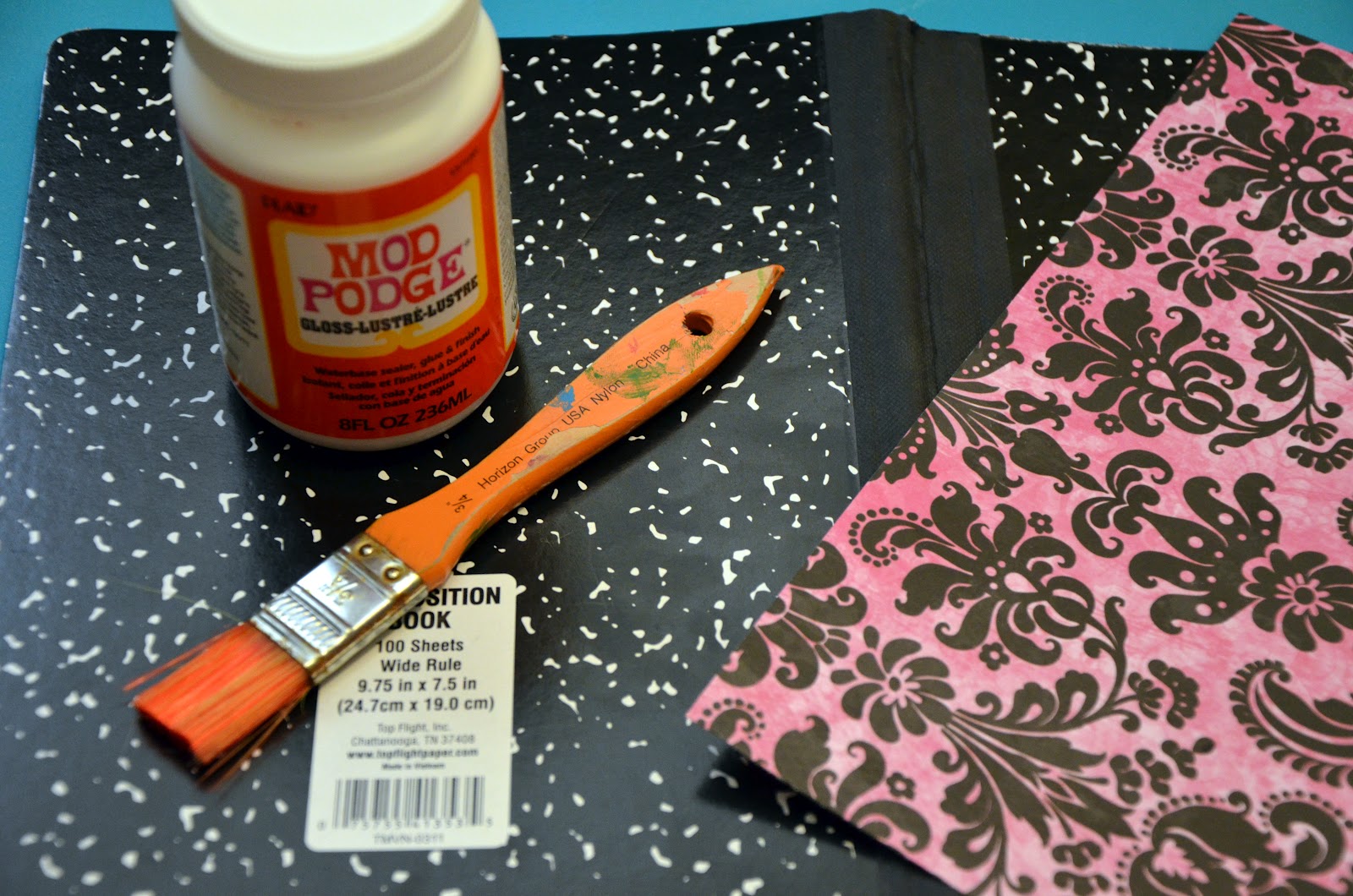 Start by coating the cover of your notebook in Mod Podge. Do your best to get a nice even layer so you don't have bubbles when you add the paper.