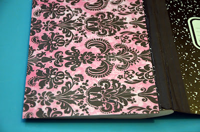 Trim your paper to roughly the same dimensions of your notebook. I say roughly because getting it perfect really isn't worth the stress. Trimming the paper later is easy. You can see in my picture I have a little gap between the edge of my paper and the black tape down the middle of the notebook. Not to worry, the washi tape will cover any mistakes.
