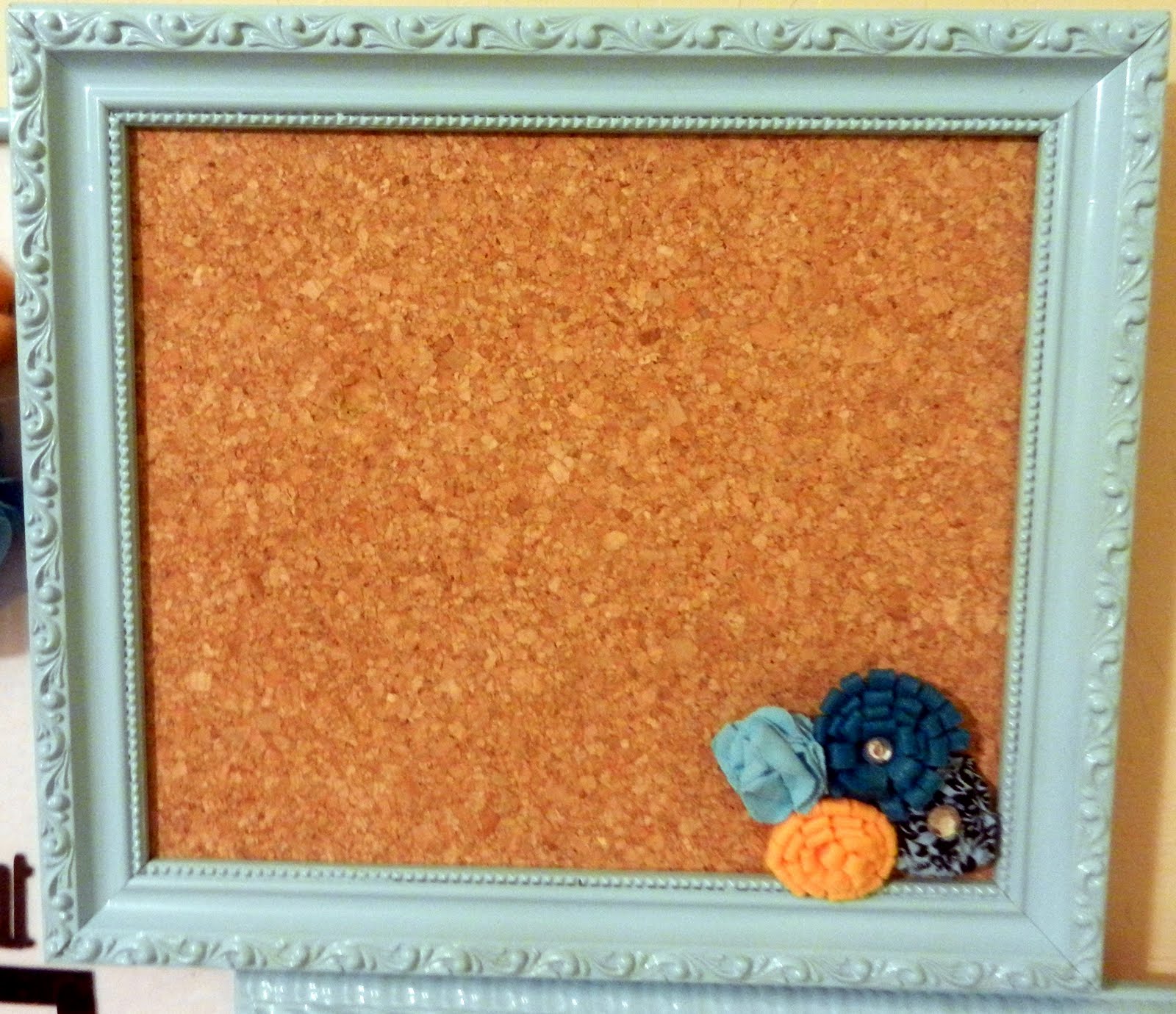 I felt like the collage was missing something. It definitely was and looked so much better after I added yellow and turquoise embellishments. I used felt and fabric to make push pins for the cork board. I made the flowers and left a small hole in the center. I filled the holes with hot glue and then carefully pushed the back of thumb tacks into the back of the flowers. I made sure the tops of the thumb tacks weren't poking through the tops of the flowers. I added a couple of rhinestones for no other reason than because I generally try to add rhinestones or glitter (sometimes both) into everything I make.