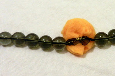 My crafty Mother In Law gave me some really pretty big round beads for a different project a couple of months ago. I ended up not using them but always knew they would be great in a necklace for myself. Aside from my usual love for turquoise, I've been pretty obsessed with the yellow and gray trend lately. I planned to string the necklace on white ribbon but changed my mind after I took a picture of my supplies.I used yellow felt to make the flower. I cut a strip of felt into four squares then folded and layered them on top of each other. I used yellow thread to put a few stitches in the center of the felt pile. I spaced my stitches about a quarter of an inch apart and pulled the thread tightly to give the flower some definition. Once the stitching was done I trimmed the sharp corners to give the embellishment a softer look.