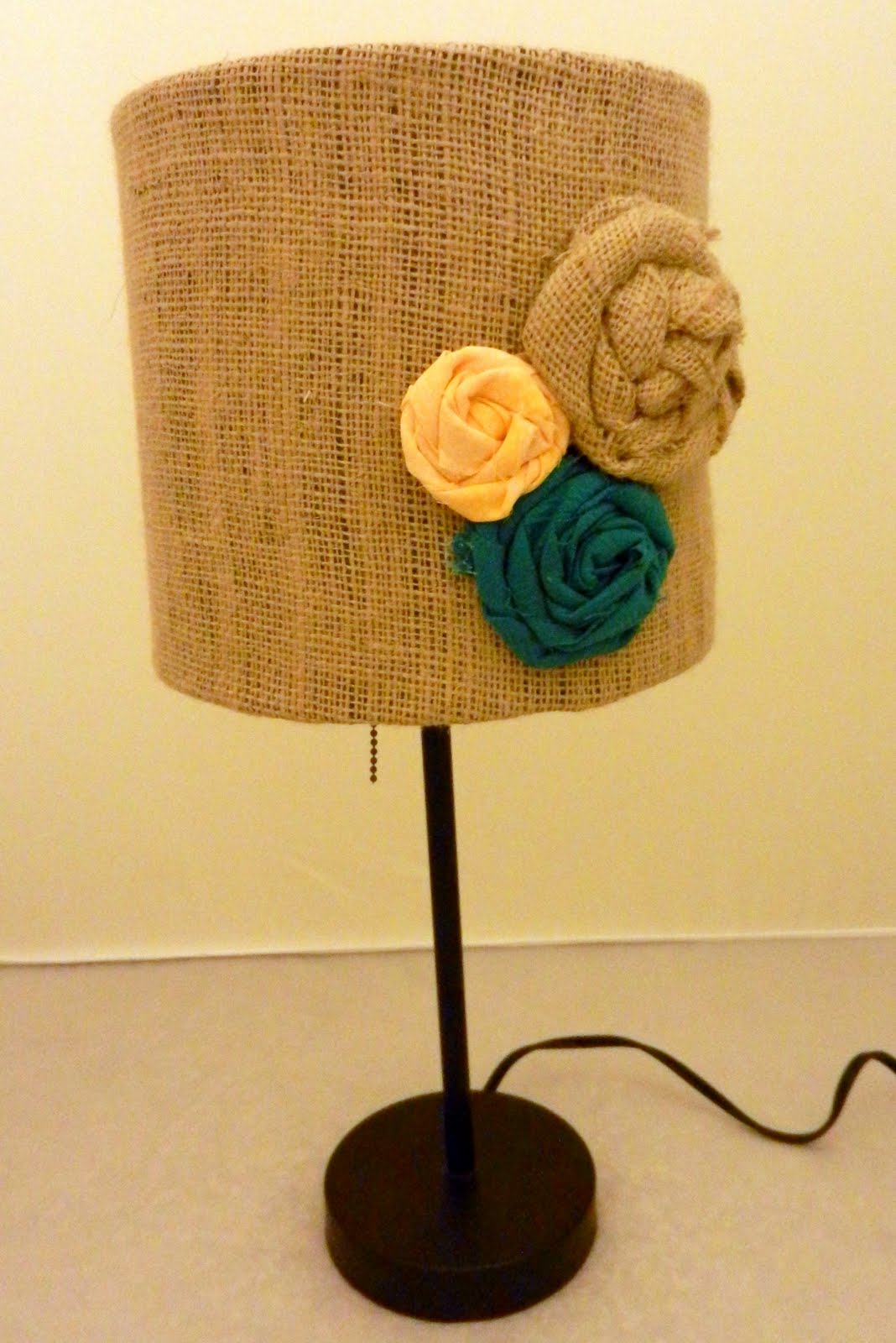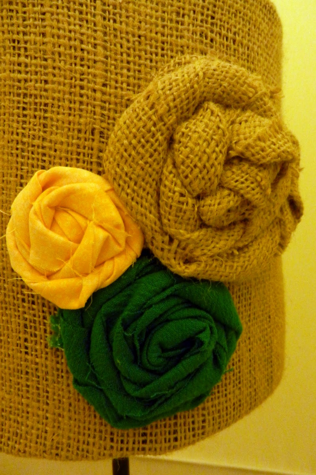 I should have done this months ago because I'm really happy with my new lamp! I used Mod Podge to cover the shade in burlap. I folded the edges over the shade and secured the burlap with my glue gun. To finish the shade, I used my glue gun to attach a few rosettes made from my scrap fabric and burlap.