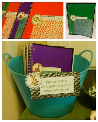 I gave each guest a dinosaur notebook as a thank you for coming to our play date. I made the notebooks using generic brand books (only 15 cents each!), animal print paper, address labels, and the cupcake toppers from the printable party pack. The texture of the paper made these really fun!