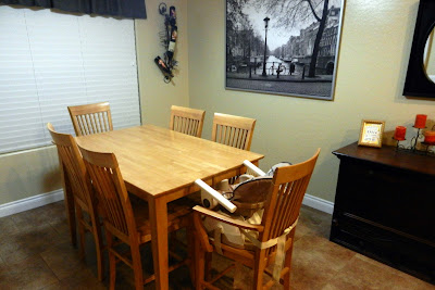 I had a big piece of burgundy fabric in my stash that was the perfect size for a small table runner.  I ended up just pressing the edges instead of using pins before I made them pretty with my sewing machine.