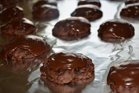 6) While your cookies are cooling, prepare the chocolate topping. In nonstick saucepan melt chocolate chips over low heat, stirring until smooth. Remove from heat and add whipping cream, butter, and vanilla. Blend well and then stir in powdered sugar until smooth.