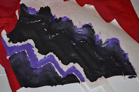 I decided to try to recreate the splattered paint effect. I used purple to neutralize the red. Tulip's soft paint in a spray bottle was perfect and didn't make too much of a mess.